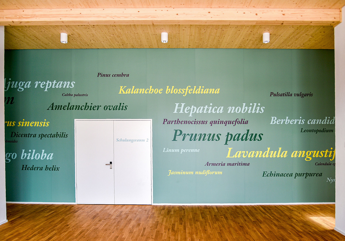 Die Lernenden und Kursteilnehmenden sowie Besucherinnen und Besucher werden in einer grosszügig gestalteten, hellen Eingangshalle empfangen. Parkettboden und Holzdecke tragen ebenso zu einer angenehmen Atmosphäre bei wie die mit Pflanzennamen beschriftete, in Grüntönen gestaltete Rückwand. Wie Zentrumsleiter Felix Werner gegenüber dergartenbau erklärt, sei es von Anfang an ein wichtiges Ziel gewesen, ein Bildungszentrum mit angenehmer Atmosphäre und optimaler Funktionaltät zu bauen. Zudem sei ausschliesslich Schweizer Holz verwendet und die Bauarbeiten durch regionale Betriebe ausgeführt worden.