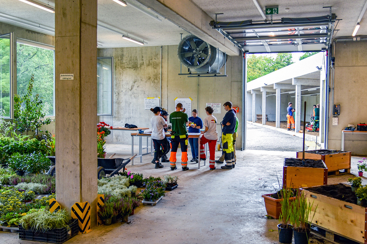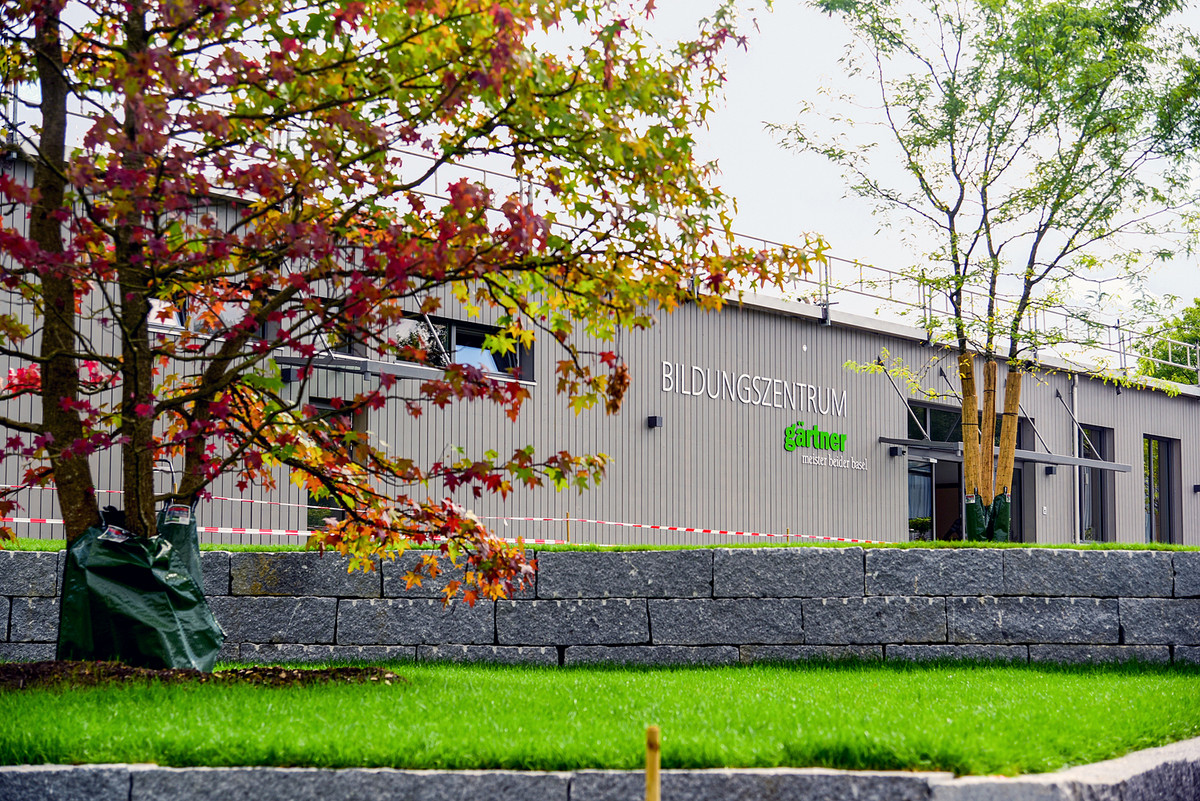 Der Bereich zwischen Gebäude und Werkhallenzufahrt ist terrassiert und die Flächen sind zurzeit mit verschiedenen Sorten Rollrasen belegt – ausgeführt durch die Teilnehmenden eines üKs. Zwölf Grossbäume (ein Geschenk der Stadtgärtnerei Basel), 1200 Stauden, die beschriftet werden, und 400 Rosen sollen nach Fertigstellung auf dem Areal zu finden sein und als Anschauungsmaterial im Unterricht dienen. «Es sind vorwiegend Pflanzen, die die Lernenden kennen müssen», meint der Zentrumsleiter.