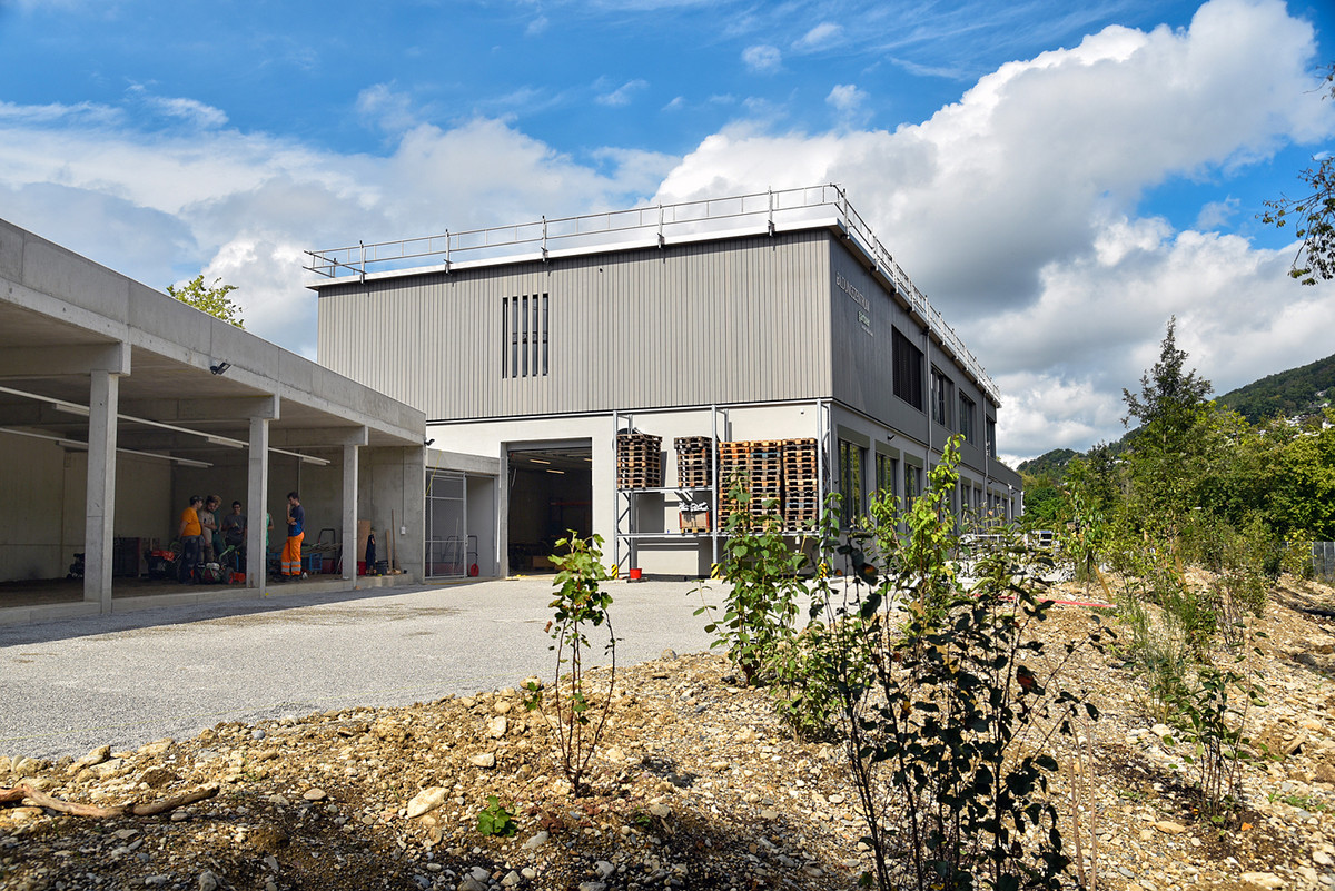 Der geschlossenen Werkhalle fügt sich eine halb offene Humushalle an sowie ein Gelände für Baggerarbeiten.