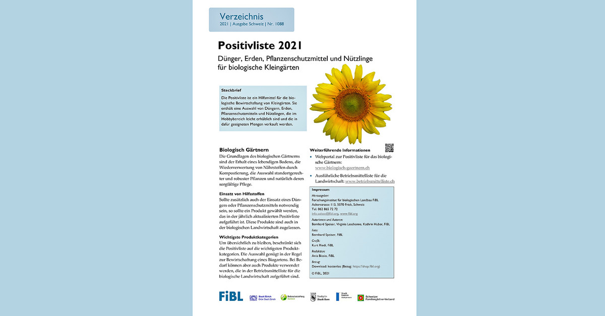 Die Positivliste enthält eine Auswahl von Düngern, Erden, Pflanzenschutzmitteln und Nützlingen, die im Hobbybereich leicht erhältlich sind und in angepassten Mengen verkauft werden. Aufgeführt sind ausschliesslich Produkte, die in der biologischen Landwirtschaft zugelassen sind. Um diesem rasch wechselnden Sortiment gerecht zu werden, wird die Positivliste jährlich aktualisiert.