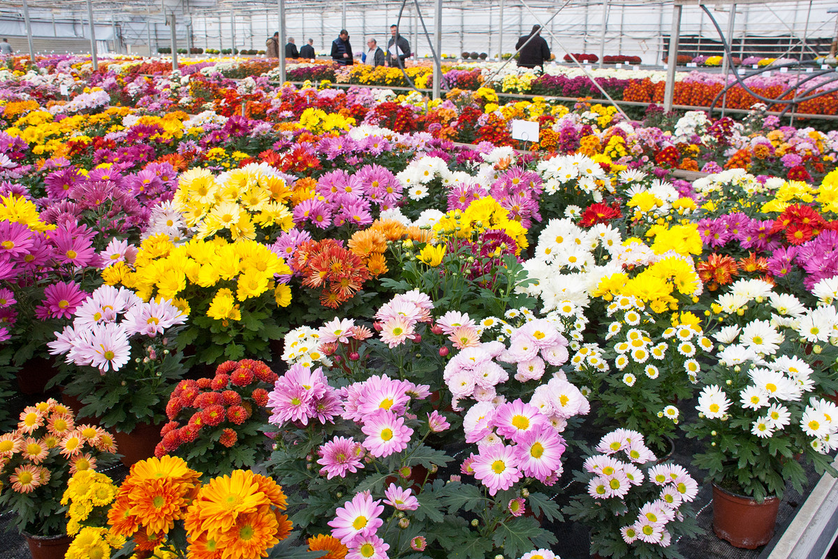 Gezeigt wird das Spektrum der bestehenden Sorten, der Neuzüchtungen für die kommende Saison, der Entwicklungen für die nächsten Jahre bei Schnittchrysanthemen, Topfchrysanthemen und Multiflora.