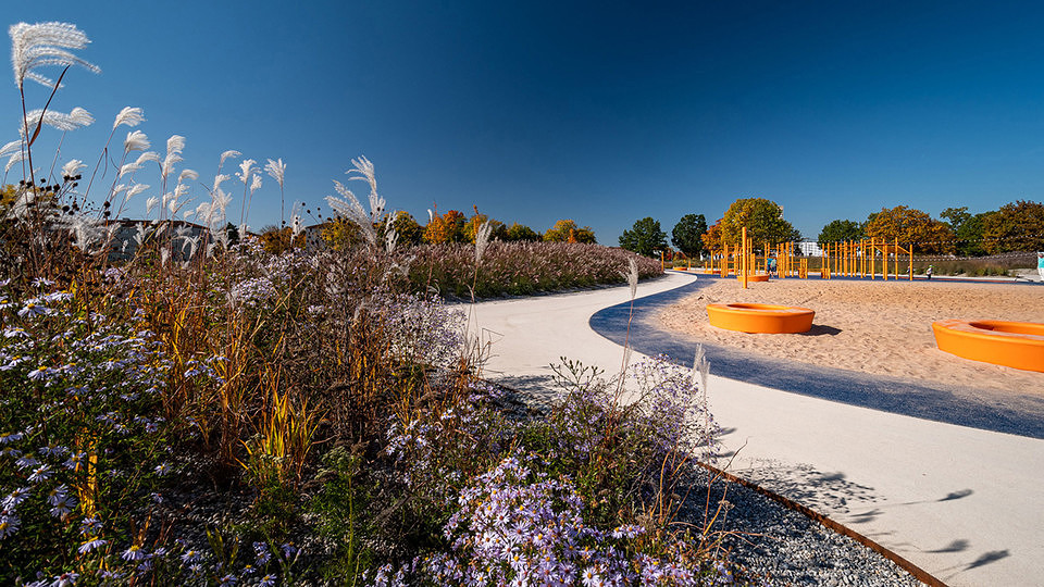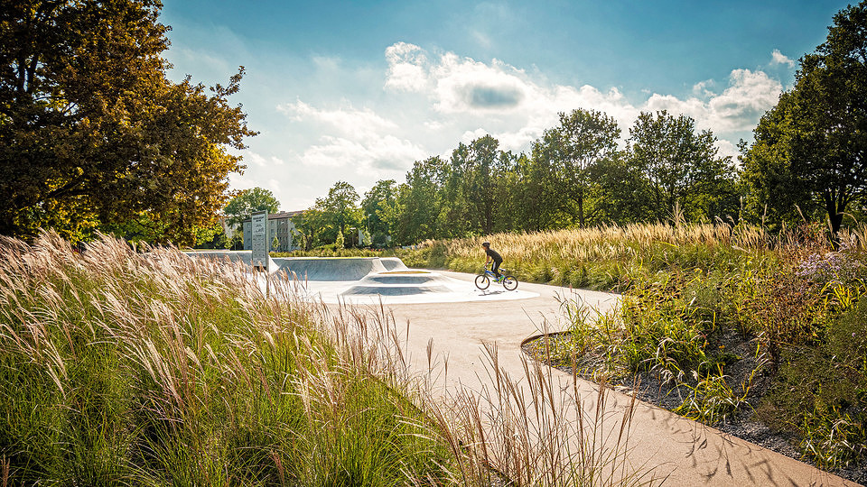 Der Park verfügt über eine hohe Dichte an verschiedenen Spiel- und Sportmöglichkeiten. Rund vier Hektaren altersübergreifende Spiel- und Sportflächen wurden geschaffen. Eine Calistenics-Anlage, vulkanartige Betonhügel zum Skaten oder Grashügellandschaften wurden in der sich durch den Park schlängelnden Hauptachse integriert. «Dabei spielten die Landschaftsarchitekten auch gekonnt mit der Topografie und nehmen so Bezug auf die nahe Wertach-Aue», betont die Jury. Der Landschaftsausschnitt «Table Mountains» dient der Bewegungsanimation für alles, was Rollen hat – vom Laufrad über Rollerblades, Bikes und Skates bis zum Rollstuhl. «Insbesondere auch durch seinen Planungsprozess leistet der Westpark einen weit über Augsburg hinausstrahlenden Beitrag für die Landschaftsarchitektur», begründet die Jury ihre Wahl. Modelle zur Flexibilisierung von Planungsprozessen, Fortführung des Planungsprozesses über die Leistungsphase 9 hinaus und Bürgerbeteiligung sind Stichworte dafür.