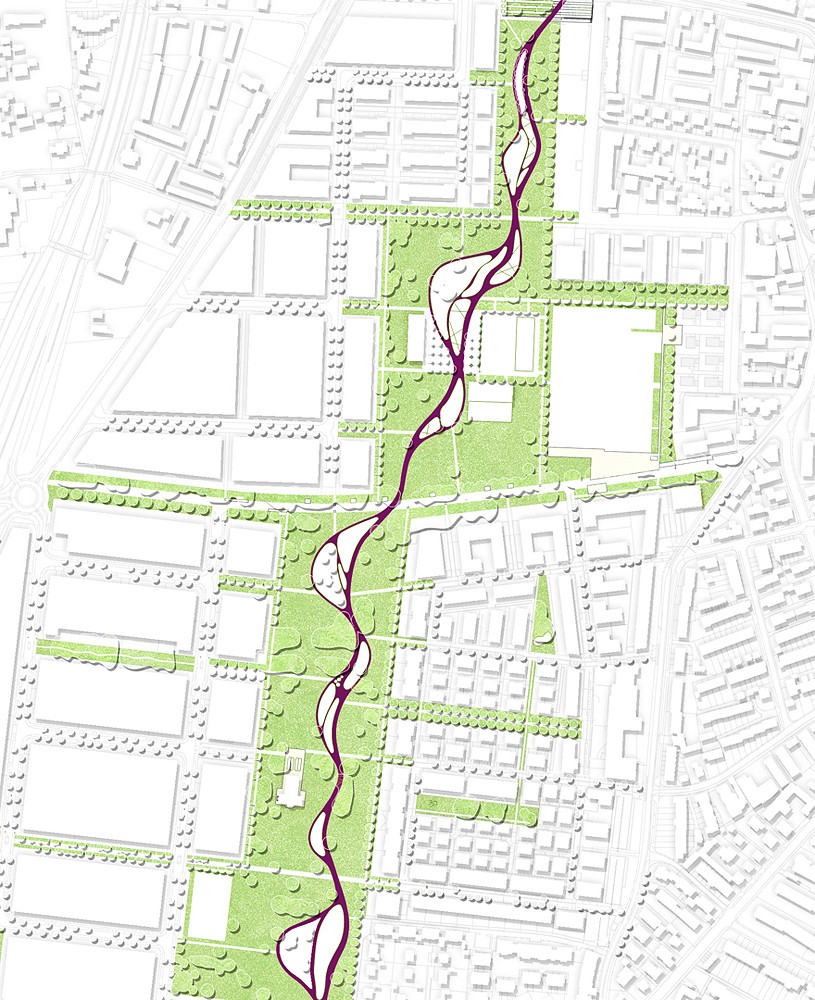 - Wohnumfeld: Park Mitte, Hamburg-Altona, Entwurfsverfasser: Krebs und Herde Landschaftsarchitekten, Winterthur/Schweiz.