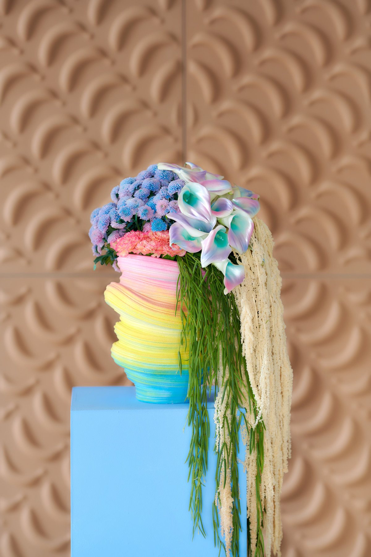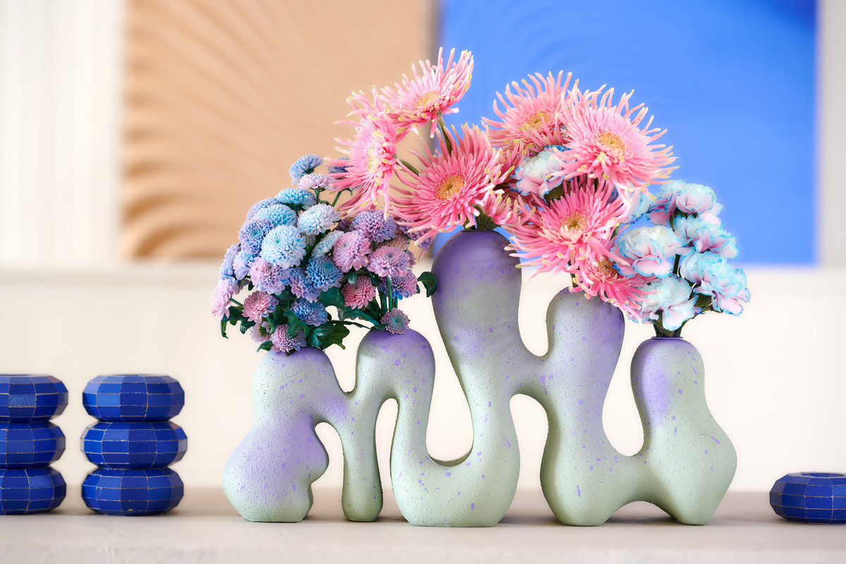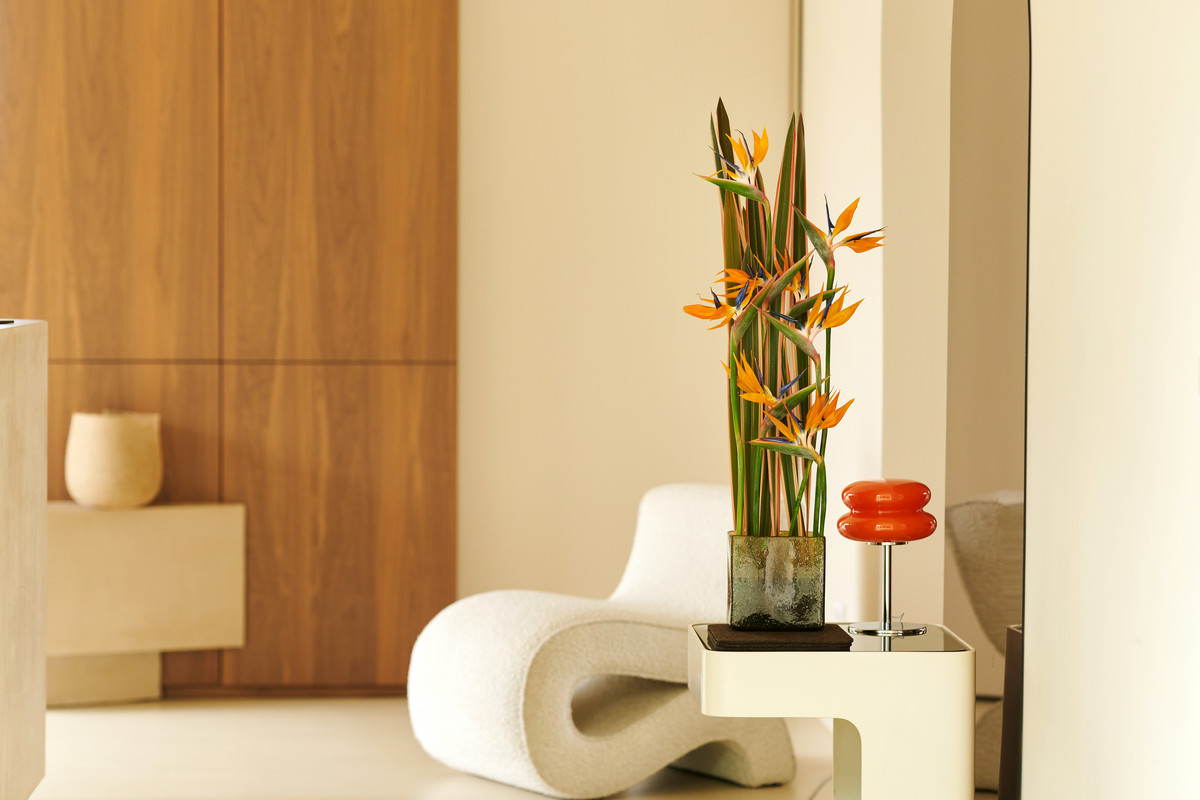 «Unexpected Encounter» greift die zunehmende Verschmelzung von Realität und digitaler Inszenierung auf. Der Stil kombiniert auffällige Formen, optische Täuschungen und kontrastreiche Farben. Chrysanthemen, Calla und Lisianthus in Neon-Pastelltönen wirken bewusst künstlich. Skulpturale Vasen und hängende Pflanzen wie Rhipsalis verstärken den experimentellen Charakter. Das Ergebnis ist ein verspielter, surrealer, dennoch poetischer und luxurioöser Einrichtungsstil.