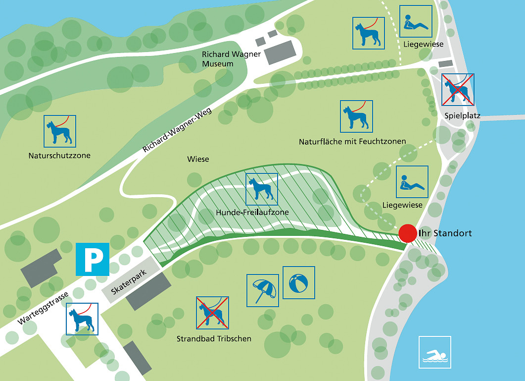 Für die Hunde wird im Rahmen der Pilotphase der Zugang zum See mit einer «Toleranzzone» (kein Leinenzwang) ermöglicht. Auf der Wiese wurde zusätzlich ein Wegnetz erstellt, das zu einer Nutzungsentflechtung und zu einer Verminderung von allfälligen Konflikten führen soll. Auf den benachbarten Flächen der Hundefreilaufzone gilt, entsprechend der kantonalen Hundeverordnung, Leinenzwang oder Hundeverbot – das Verbot betrifft den Spielplatz sowie das Areal des Strandbades Tribschen.