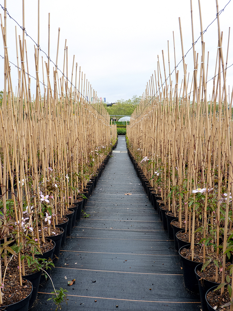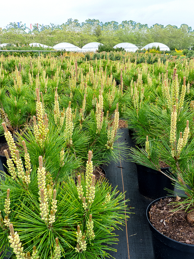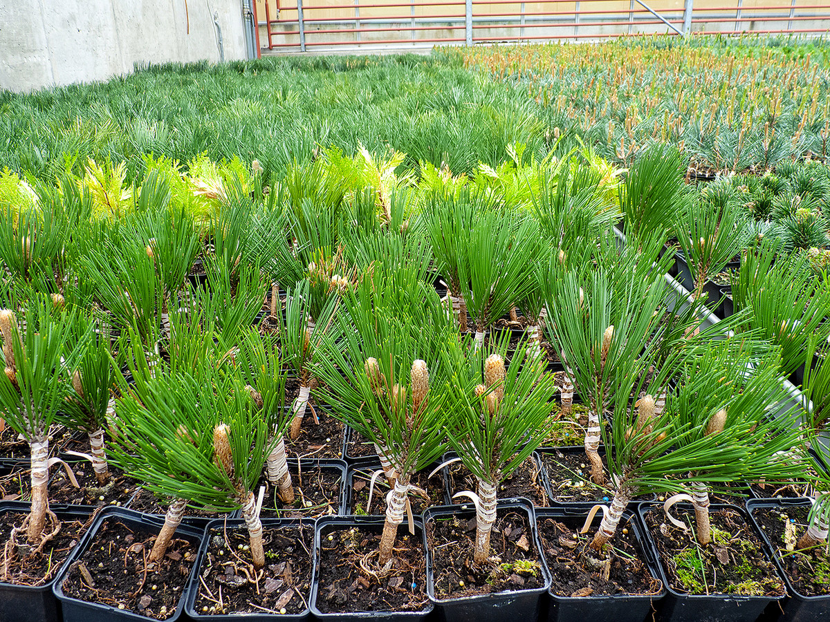 Die Baumschule Meylan, die 2018 ihr 120-jähriges Bestehen feierte, beschäftigt 35 Mitarbeitende und 4 Lernende der Fachrichtung Baumschule (EFZ). Mit einer Gesamtfläche von 200 000 m² ist der Betrieb ein grünes Juwel inmitten der Industriezone von Renens. Dort wird auch auf 40 000m² ein breites Sortiment an Koniferen, Laubgehölzen, Schlingpflanzen und Bodendeckern im Container kultiviert. Die Vorkultur erfolgt in den Gewächshäusern (4000 m²) und in den Folientunnels (2000 m²) des Betriebes. Jährlich werden über 120 000 Koniferen und Laubgehölze veredelt. Die Veredelungstechniken sind – abgestimmt auf Gehölzart und Wuchsform – vielfältig und technisch anspruchsvoll. «Für den Verkauf als Jungpflanze im 9-cm-Topf werden jährlich über 400 000 Stecklinge produziert», berichtet Michel Meylan. Es gelte, die Kundinnen und Kunden mit einem besonderen Sortiment zu begeistern. So finden sich im über 100 Arten umfassenden Koniferensortiment beispielsweise die beiden sortenrechtlich geschützten Pinus-nigra-Sorten ’Marie Brégeon’ und ’Pierrick Brégeon’. Die Koniferenstämmchen punkten mit einem sehr dichten und dekorativ frischgrünen Nadelkleid.