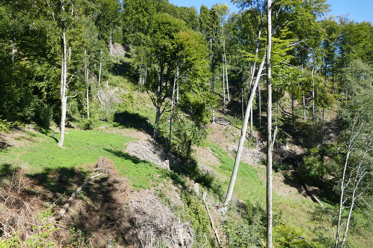 In der Tüelen im Oberen Tösstal wurde ein potenziell artenreicher Waldhang aufgelichtet und eine zuwachsende Waldwiese entbuscht und wieder mähbar gemacht. In Kombination mit den Wiesen der Umgebung bietet sich hier nun für zahlreiche Arten ein idealer Lebensraum. Bild: Heiri Schiess