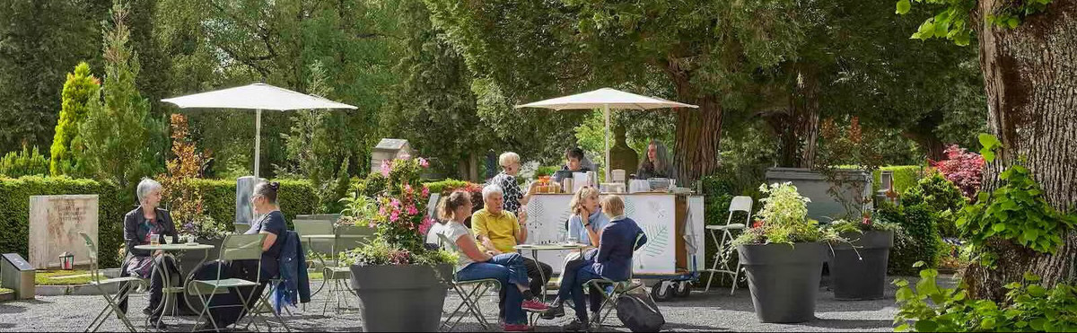 Inspiriert von den Friedhofscafés in Berlin, die dort Teil einer neuen, offenen Friedhofskultur sind, startete Silvia Strahm Bernet gemeinsam mit fünf Frauen aus dem Arbeitskreis pensionierter Theologinnen eine Initiative für das in der Schweiz einzigartige Projekt eines Friedhofscafés. Auch dieses Projekt ist aus der Umnutzung des Krematoriumsareals hervorgegangen. Da sich das Areal selbst nicht für ein Café eignete, wurde ein alternativer Ort auf dem Friedhof gesucht. Der Platz unter der grossen Linde mit Blick auf den Rotsee bot sich an. Die Initiantinnen stiessen beim Leiter der Friedhöfe Luzern, Pascal Vincent, auf offene Ohren: Er erkannte darin die Chance, den Friedhof noch stärker zu einem Ort der Begegnung zu machen. Favorisiert wurde ein mobiles Café, bestehend aus einem Wagen mit Kaffeemaschine, Kühlschrank und Geschirr sowie drei kleinen Tischen mit zwölf Stühlen. Mehr Tische soll es nicht geben, erklären die Initiantinnen: «Zusammensitzen ist fruchtbar für Gespräche.» Nach Betriebsschluss wird das Mobiliar abgeräumt und in einer Box verstaut.