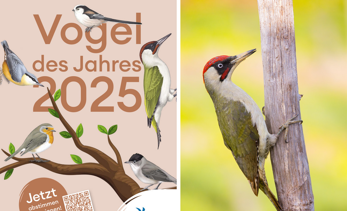 Wahlplakat für den «Vogel des Jahres 2025». Rechts: der Grünspecht. Bild: Ralph Martin/BirdLife Schweiz