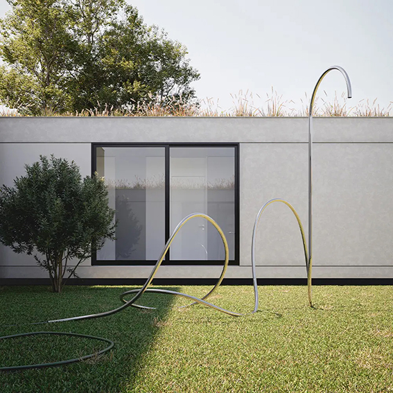 Die spielerische DocolChu-á Outdoor-Dusche interpretiert den Gartenschlauch als poetisches Funktionsobjekt und setzt einen nostalgischen Akzent.