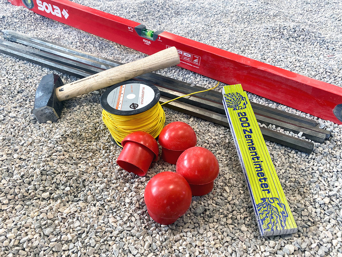 Dass Werkzeuge in den verschiedenen Regionen einen eigenen Namen tragen, weiss man. Besonders betroffen davon ist jener 80 bis 140 cm lange und 14 bis 22 mm starke, angespitzte Stahlstab, der im Fachhandel als «Absteckeisen» oder «Schnurnagel» gehandelt wird. Das Eisen wird mit dem Hammer eingeschlagen und ermöglicht in Kombination mit Maurerschnur, auch auf festerem Untergrund die Pflasterfläche zu markieren.
