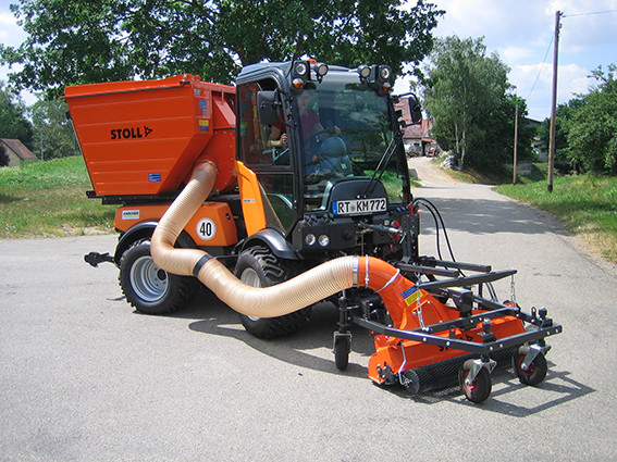 Auch andere Fabrikate nehmen Grünschnitt oder Herbstlaub zunächst mechanisch auf, der Weitertransport erfolgt danach aber per Luftstrom. So funktioniert es etwa mit der Mehrzwecksaugdüse FLS 12 (170 kg, 120 cm) von Stoll für den Frontanbau an Traktoren und anderen Fahrzeugen. Anstelle der standardmässig verbauten Kehrbürste lässt sich auch ein Zinkenrotor für Herbstlaub montieren, für zusätzliche Einsatzvielfalt auch eine Vertikutierwalze.