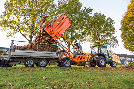 Der niederländische Hersteller Schouten bietet mit dem Phoenix PX1802 (180 cm) einen Ladeanhänger für Schlepper, der per Zapfwelle angetrieben wird. Seine Kehreinheit besteht aus zwei Rotoren. Auf dem unteren Rotor sind vier langlebige Kunststoffbürsten montiert, um das Produkt aufzukehren. Der obere Rotor hat flexible Windflügel, die für eine Saugwirkung sorgen. Dadurch wird das Produkt vom unteren Rotor übernommen und in den Auffangbehälter befördert. Die Radsätze der Phoenix-Kehrmaschinen sind nach dem Pendelprinzip gebaut. Dadurch wird die Anpassung an den Untergrund optimiert. Mit ihren grossen Rädern verhindern diese Radsätze auch Spurrillen und Schäden am Untergrund oder der Grasnarbe.