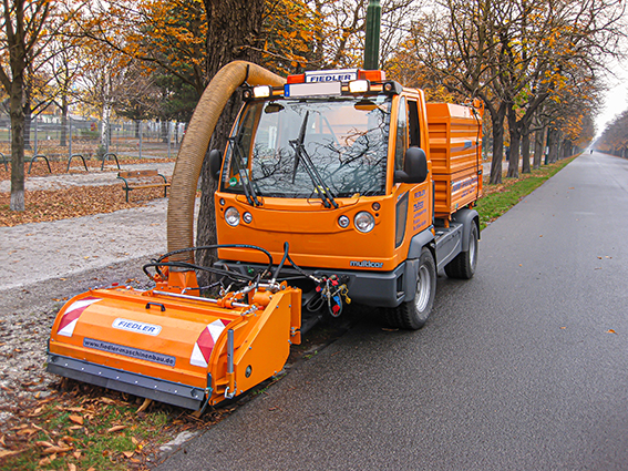 In manchen Fällen kann es aber sinnvoll sein, nicht auf die Zugkraft eines starken Luftstroms zu vertrauen, sondern das Laub mit mechanischen Mitteln aufzunehmen. Fiedler Maschinenbau gehört zu den wenigen Herstellern, die ein solches Anbaugerät haben, nämlich das Modell FLA 1300 (Gewicht 360 kg, Arbeitsbreite 130 cm), das in Kombination mit einem Geräteträger der Bauart Multicar funktioniert. Wer beispielsweise auf Splittflächen oder wassergebundenen Wegen arbeiten und nicht das Oberflächenmaterial wegsaugen will, wird in einer solchen mechanischen Aufnahme einen Gewinn sehen. Während das Material auf Grünflächen über eine Zinkenwelle aufgenommen wird, lässt sich diese für Arbeiten auf festem Untergrund (z. B. Asphalt, Pflaster usw.) gegen Bürstensegmente austauschen, um empfindliche mineralische Oberflächen zu schonen. Die Aufnahme des Materials erfolgt zunächst rein mechanisch, erst nach der Querförderung über eine Schnecke und dem Kleinschneiden wird es über eine Wurfturbine in den Sammelcontainer weiterbefördert.