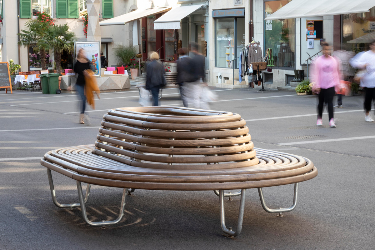 «Mit wenigen, aber präzisen Eingriffen ist es gelungen, die Rathausstrasse in Liestal in einen lebendigen und schönen Stadtraum zu verwandeln, in dem die Menschen sich gut, gern und selbstverständlich zu Fuss bewegen. Dieses selbstverständliche Funktionieren kennen wenige vergleichbare Umgestaltungen.» Mit diesen Worten würdigte Marionna Schlatter, Präsidentin von Fussverkehr Schweiz, die Leistung der Stadt Liestal beim Umbau der Rathausstrasse an der Preisverleihung des Flâneur d’Or. Die zehnköpfige Jury war überzeugt von der Mischung aus Pragmatismus und Eleganz. Eine neue, durchgehende Asphaltfläche hat die schmalen Trottoirs aufgelöst. Granit-Naturstein-Bänder führen rechtwinklig von der Abwasserrinne in der Mitte zu den Parzellengrenzen und spiegeln die historischen Fassaden. Sie markieren 54 unterschiedlich grosse Vorplätze und rhythmisieren so die Strasse. Eigens angefertigte runde Sitzbänke sind wie Inseln in diese Fläche eingefügt. «Kein Denkmal, keine Verkehrsschilder, noch nicht mal Abfallkübel versperren den Durchgang», so der Fachverband in der Medienmitteilung.