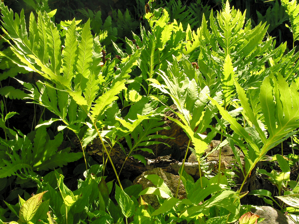 Farbiges Laub setzt sich derzeit in der Gartengestaltung durch. Stauden und Gehölze bieten hier eine kaum überschaubare Vielfalt. Bei den Farnen ist die Auswahl allerdings eher beschränkt. Sie wirken mehr durch ihre Vielzahl an Grüntönen. Aber auch damit lassen sich wirkungsvolle Akzente setzen. Vor allem die frischgrünen Wedel höherer Arten wie Onoclea sensibilis leuchten in dunklen Arealen wie Fackeln. Ihnen wird als Kontrast am besten ein dunkler Untergrund, beispielsweise mit dem Haselwurz (Asarum europaeum) geboten. Die Gemeinschaft ist äusserst beständig, langlebig und bedeckt den Boden mit einem minimalen Pflegeaufwand.