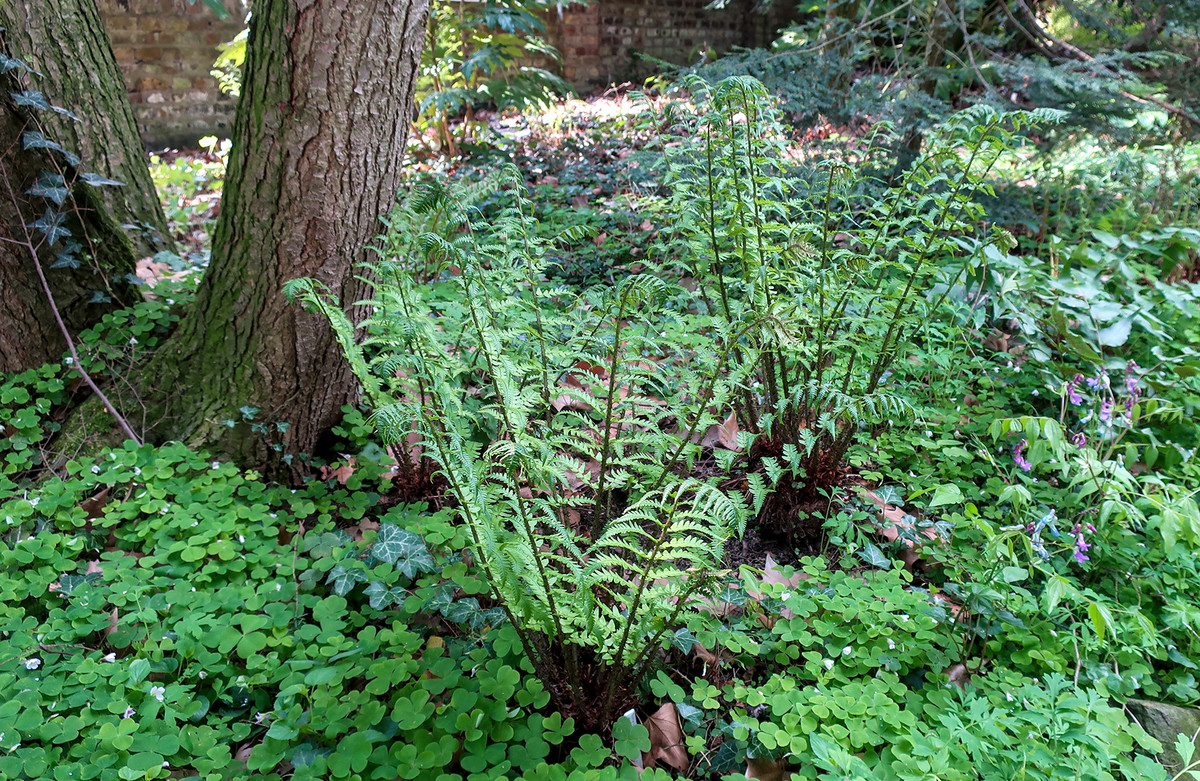 Allerdings bilden einige Farne, beispielsweise Gymnocarpium dryopteris und Onoclea sensibilis, Rhizome und können damit in kurzer Zeit beachtliche Strecken überwinden. Hier hilft nur eine entsprechende Rhizomsperre, um den Pflege-aufwand benachbarter Grünflächen in Grenzen zu halten. Am besten ist es, solchen Farnen ein grosszügiges Areal zuzuweisen, wo sie sich problemlos ausbreiten können. Das gilt auch für Arten wie der heimische Wurmfarn (Dryopteris filix-mas), die sich durch ihre Sporen leicht ausbreiten.