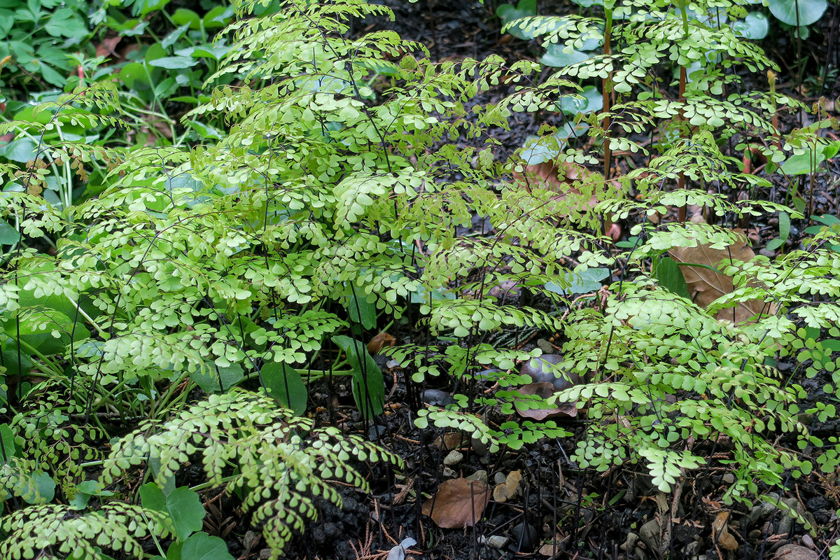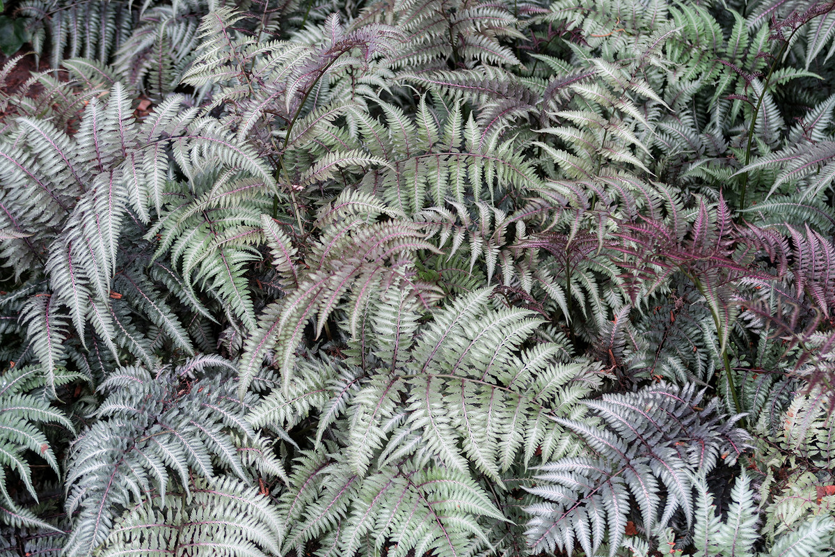Besonders begehrt sind derzeit Farnarten, die über farbiges Laub oder einen intensiv farbigen Austrieb verfügen, allen voran Athyrium niponicum ‘Metallicum’, der Regenbogen-Farn aus Asien. Er zeichnet sich durch seine silberblau-metallisch gefärbten Wedel aus und bildet einen schönen Kontrast zu anderen grünen Strukturen. Darüber hinaus gibt es einige Farne, die einen sehr attraktiven bronzefarbenen Austrieb besitzen (Dryopteris erythrosora, Osmunda regalis). Im Laufe des Jahres nimmt die Färbung aber immer mehr ab und geht in ein normales Blattgrün über. Schön sind bei vielen Arten auch die mit rostroten Schuppen besetzten jungen Wedel, die sich wie kleine Kunstwerke entrollen. Bei dem Hirschzungenfarn sind die jungen Blätter mit einem silbrig-wolligen Mantel versehen. Vor einer dunkelblättrigen Kulisse ist das für eine kurze Zeit ein echter Hingucker. Attraktiv ist auch der Austrieb vom Himalaja-Frauenhaarfarn (Adiantum venustum). Ähnlich wie der tropische Frauenhaarfarn trägt die feingliedrige Art auf schwarzen Stielen kleine, lindgrüne Blättchen.