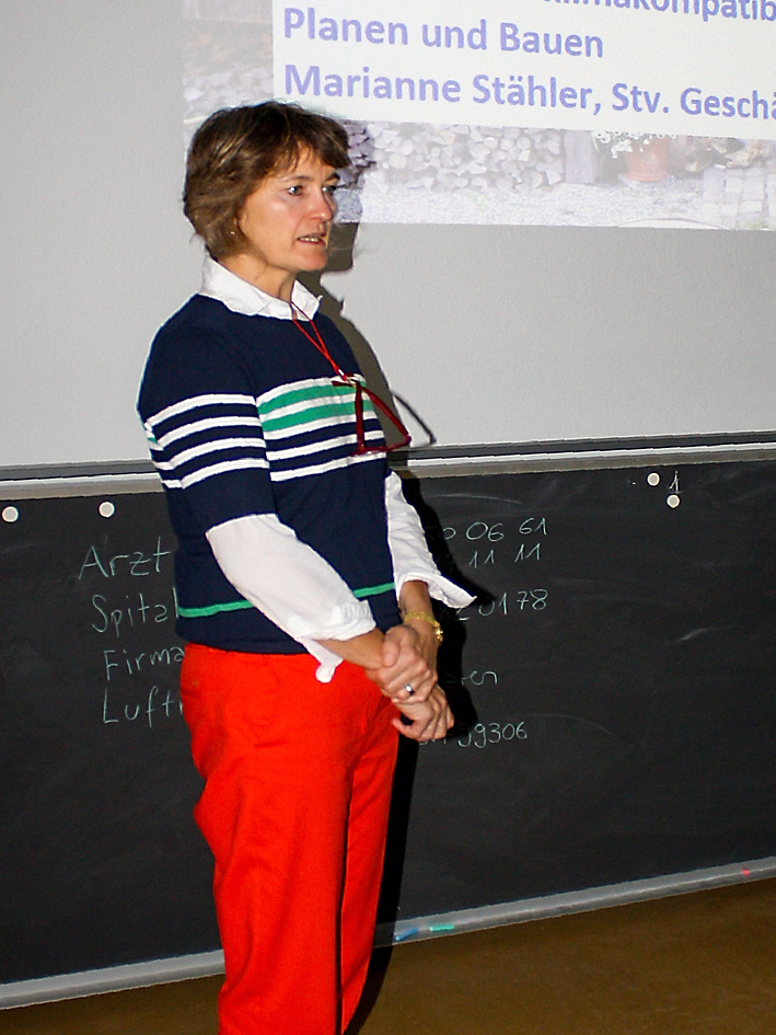 In ihren Referaten stellten Marianne Strähler (Stellvertretende Geschäftsführerin «eco-bau», Zürich) und Severin Lenel (Leiter Zertifizierungsstelle «Minergie-ECO», Basel) die Aktivitäten und Angebote der beiden Institutionen vor.