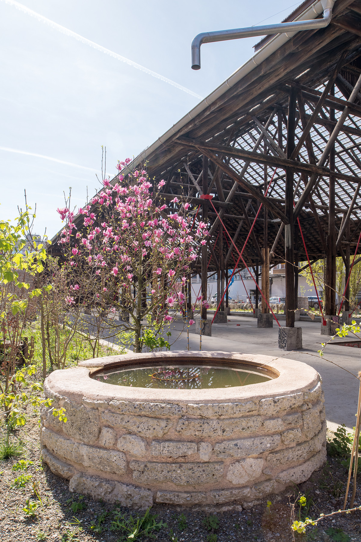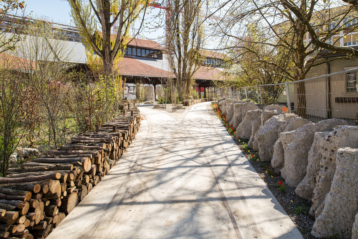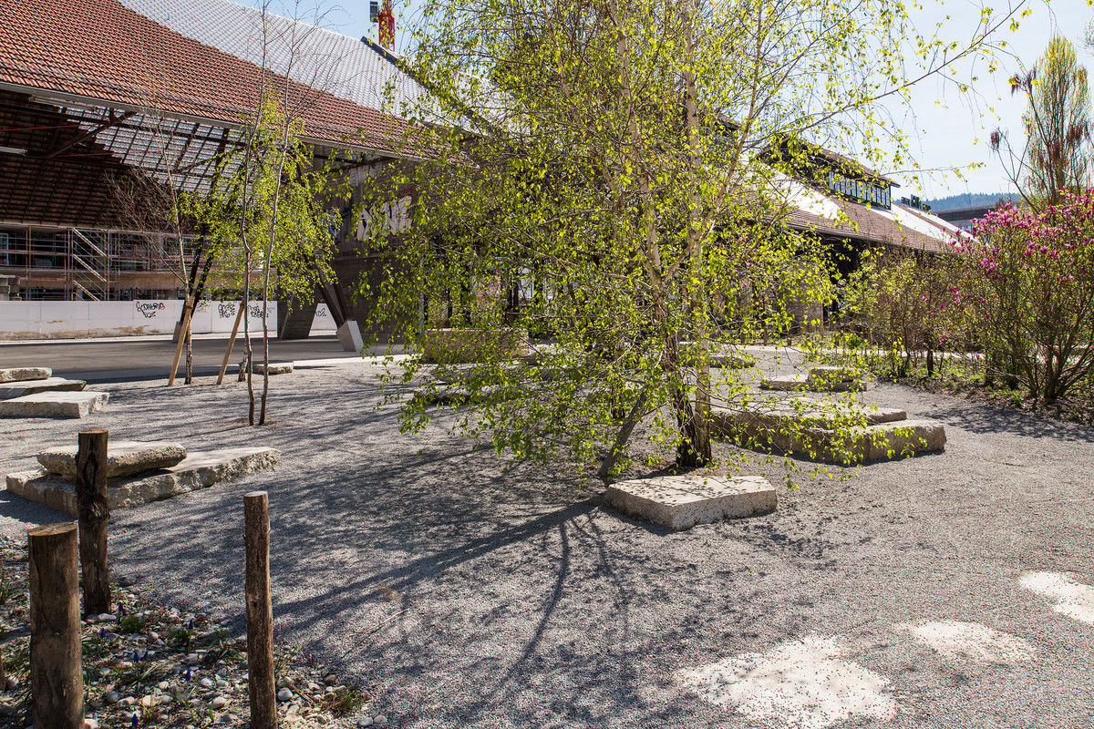 Beidseitig der Halle erstreckt sich der «jardin sauvage», ein naturnaher Stadtgarten mit wilden Flächen, Totholz und wiederverwendetem Baumaterial wie Betonbruch. Der Park setzt, so die Mitteilung, ein Zeichen für klimaangepasste Stadtentwicklung: Mit alten Baumbeständen, hellen Belägen, viel unversiegelter Fläche und intelligentem Regenwassermanagement trägt er zur Hitzeminderung bei.