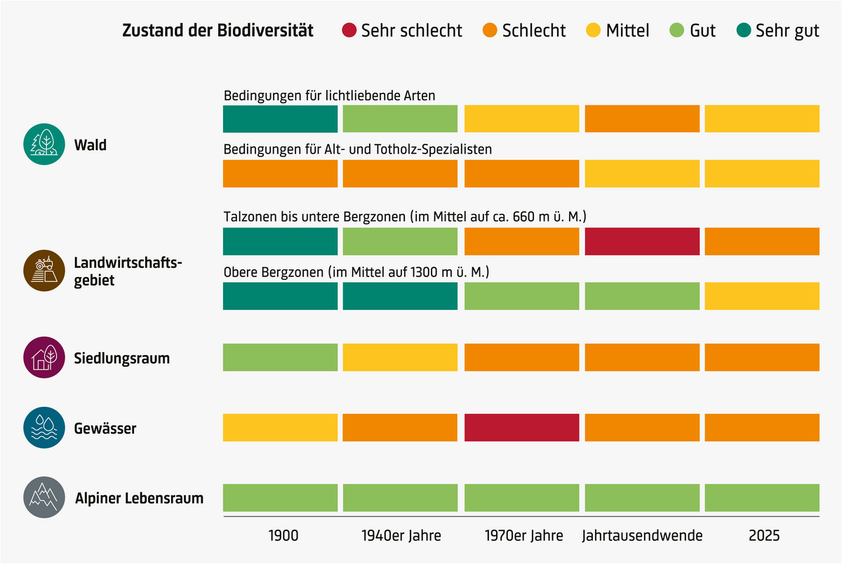 Neben diesen positiven Entwicklungen gibt es auch negative: Das Niveau der Biodiversität sei grundsätzlich tief und wird in den Gewässern, im Siedlungsraum und im Landwirtschaftsgebiet in den Tal- bis unteren Bergzonen weiterhin als «schlecht» bewertet. Laut der SCNAT werden Artengemeinschaften und Lebensräume immer wie einheitlicher.