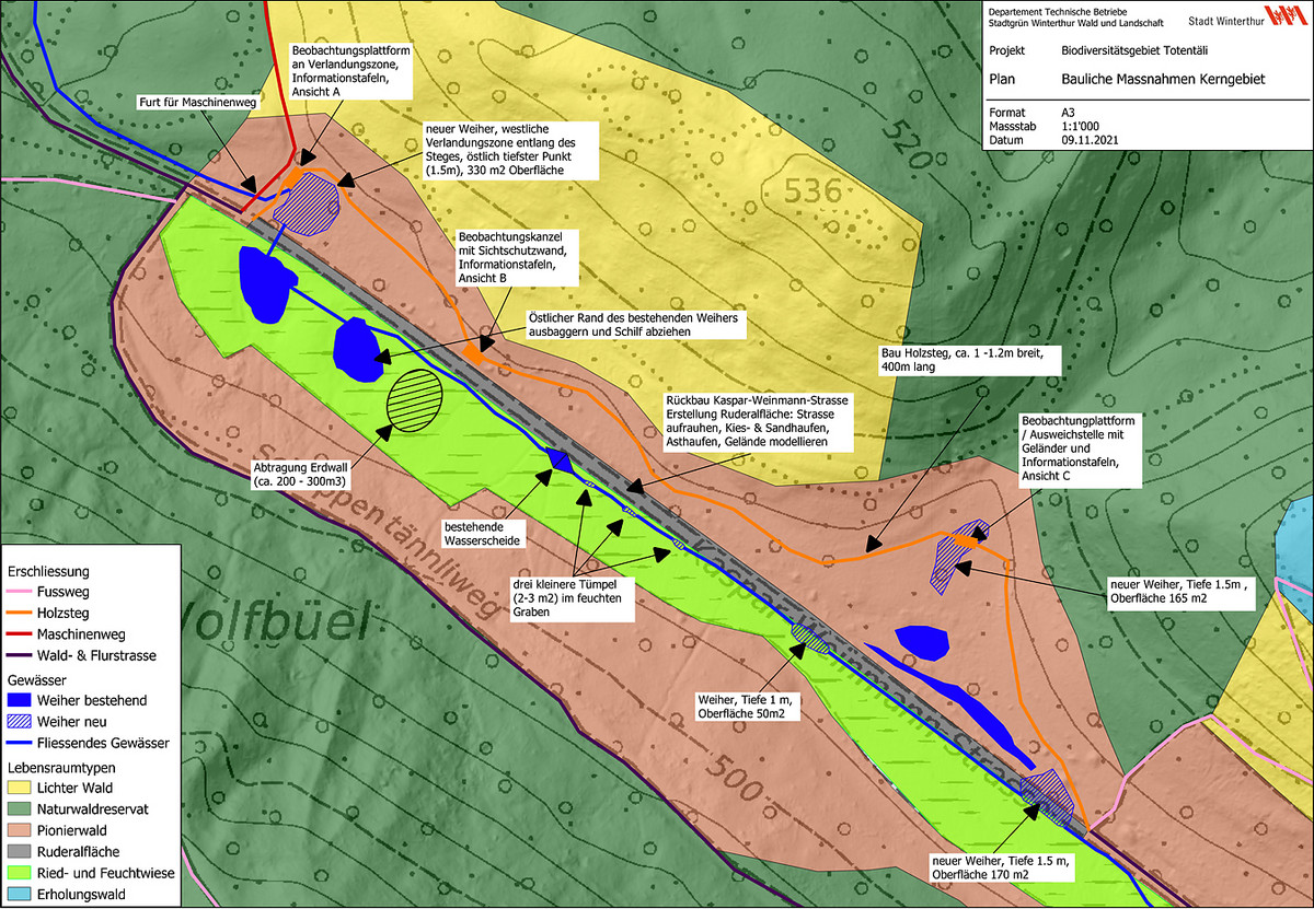 Das Totentäli bei Wülflingen mit seiner grossen Feuchtwiese und den Amphibienweihern befindet sich im Bundesinventar der Amphibienlaichgebiete von nationaler Bedeutung. Es ist umgeben vom Waldreservat Schuppentännli. An den Südhängen angrenzend an das Waldreservat befinden sich lichte Wälder. Diese Gebiete, die sich vom Weihertal im Dättnau über Hoh-Wülflingen, das Totentäli und Alt-Wülfingen bis zum Schlosstal erstrecken, werden zum «Biodiversitätsgebiet Totentäli» verknüpft.