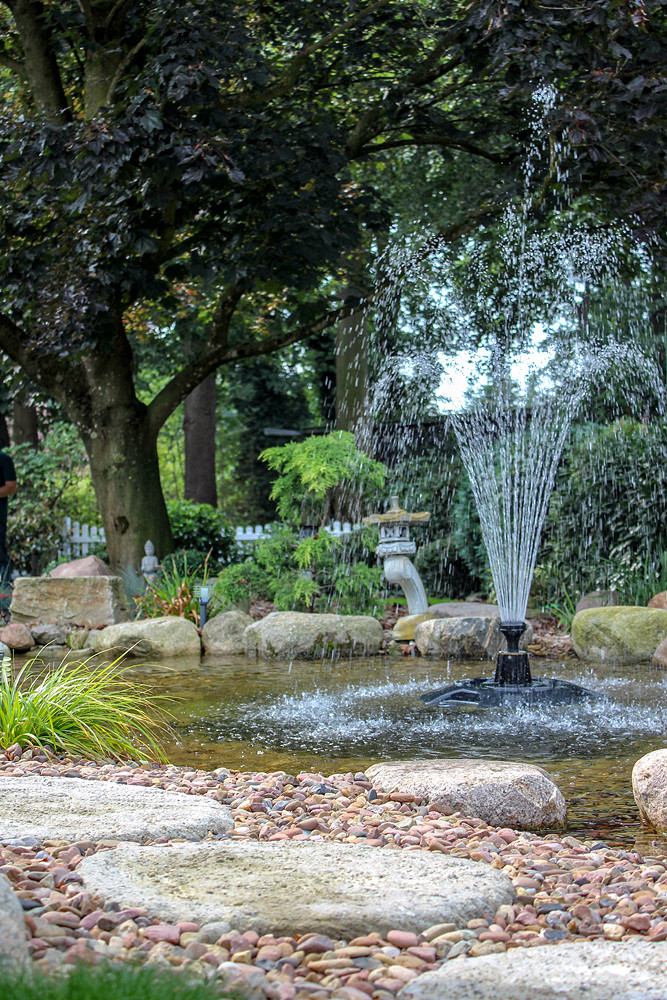 Der zweite Privatgarten, den wir besichtigten, wurde durch die Firma Backhaus erweitert. Seit Jahren führt sie den Unterhalt in diesem Kundengarten aus. Der neue Bereich ist im Stil eines Japangartens gestaltet. Es wurden ein Teich und eine Terrasse in geschwungener Linienführung angelegt. Das Thema Japangarten wurde zusätzlich mit einer kleinen Pagode und diversen Ausstattungsgegenständen verstärkt. Bereits beim Garteneingang wird das Thema angedeutet, was besonders harmonisch erscheint. Aufgrund der sauren Böden in dieser Region sind Azaleen und Rhododendron häufig verwendete Gartenpflanzen. Die üppige Azaleen- und Rhododendrensammlung in den verschiedenen Gartenteilen schafft eine Verbindung zum Japangarten.