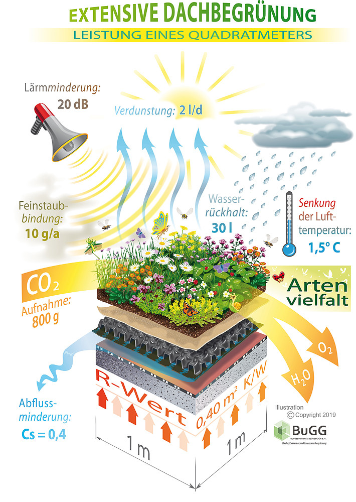 Die Leistungen eines Quadratmeters extensive Dachbegrünung.Graphik: GPP/BuGG