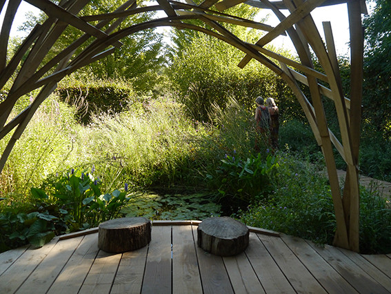 Für viele Menschen ist der ideale Garten ein Ort der biologischen Vielfalt. Dort gedeiht neben der Flora auch die Fauna – ob nun gross oder mikroskopisch klein. Nicht zuletzt Nymphen, also Insekten, die beim Häuten eine Metamorphose erfahren, aber auch mythologische Gottheiten sind, Naturkräfte personifizieren und oft dabei mit Bergen, dem Wasser und den Wäldern verbunden sind. Vom Zugang aus gesehen hinter einem Blumenhügel verborgen, gab es einen schmalen Pfad aus Holzplanken zu entdecken, der um einen Teich herum und zu einem nestartigen Pavillon aus Holzlatten führte. Dieser erhob sich leicht über den Teich und die Blüten ringsum und eröffnete von dort den Blick auf Amphibien, Libellen, Schmetterlinge und Reptilien in dem kleinen Garten Eden.