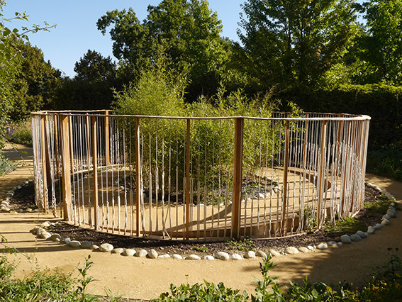 In der Philosophie des Taoismus steht der Ring, der ohne Anfang und Ende ist, für das Universum, die Natur, die Ewigkeit. Während es in unserer schnelllebigen und komplexen Welt leicht ist, sich zu verlieren, bringt und führt uns der ideale Garten zu Einfachheit, Gelassenheit und Unverfälschtheit zurück. Zu dem Bild gehören etwa Blumen und Pflanzen, Kühle und Schatten sowie das Rascheln der Blätter. Ebenso aber auch ein Berg und der Himmel. Genau das zeigte das Trio, das hier westliche und östliche Ideen im Garten verschmolz – in Form eines Rondells, das um Bambus im Zentrum wie ein schützender Käfig angelegt war. Mit vertikalen Seilen scheinbar abgeschlossen, taten sich auf den zweiten Blick doch zwei Zugänge in das Innere des Gartens auf, symbolisch gefasst von einem kleinen Berg in Form einer niedrigen, begehbaren Rampe.