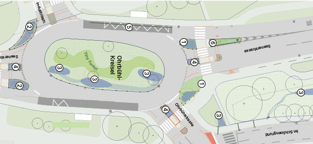 Das Wasser im Bereich des Kreisels Ohrbühl gelangt bislang ohne Reinigung in die Eulach. Erstmals werden im Rahmen eines Kreiselverkehrs fünf unterschiedliche Systemtypen parallel installiert und im Betrieb verglichen: Versickerungsmulden, Staudenbeete und Baumgruben übernehmen die Versickerung und Verdunstung des Strassenabwassers, während zwei neu entwickelte technische Filtersysteme gezielt Schadstoffe wie Schwermetalle oder Reifenabrieb zurückhalten. Ergänzt wird dies durch eine Neupflanzung von neun standortangepassten Bäumen, die die Mikroklimawirkung verstärken sollen.