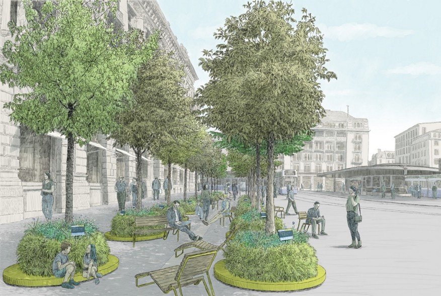 Die Bäume, darunter Hainbuchen, Linden, Ulmen, Magnolien und Eisenholzbäume, sind in Air Pots auf Podesten mit Wasserspeicher platziert. Umgeben von Sitzgelegenheiten schaffen sie Aufenthaltsqualität und zeigen, wie Begrünung auch auf versiegelten Flächen möglich ist.